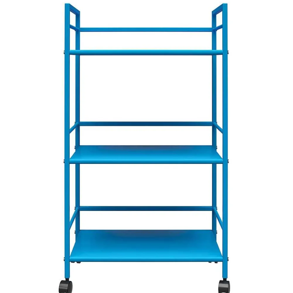 Die Oberfläche des Servierwagens ist pflegeleicht pulverbeschichtet und strahlt in lebendigem Türkis Blau. Die obere Reling dient nicht nur der Optik, sondern auch als praktischer Griff. Vier Kunststoffrollen, davon zwei arretierbar, sorgen für mühelose Mobilität. Die Platte aus Metall ist maximal bis zu 9 kg belastbar, während die dreiseitige Begrenzung der Böden für sicheren Halt sorgt. Zwei zusätzliche Ablagen bieten reichlich Stauraum, perfekt für Snacks, Getränke oder dekorative Elemente.