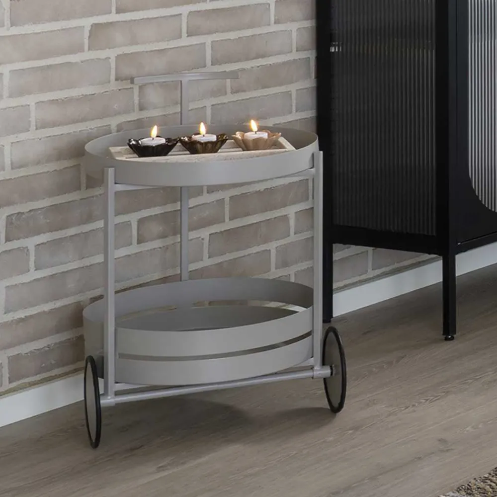 Dank der beiden großen, leichtgängigen Räder ist der Servierwagen „Veladrano“ jederzeit mobil und flexibel einsetzbar. Die zwei runden Ablagen mit erhöhtem Rand bieten ausreichend Platz für Getränke, Snacks oder dekorative Elemente. Ob im Esszimmer, in der Küche oder auf der Terrasse – „Veladrano“ ist immer dort, wo Sie ihn gerade brauchen.