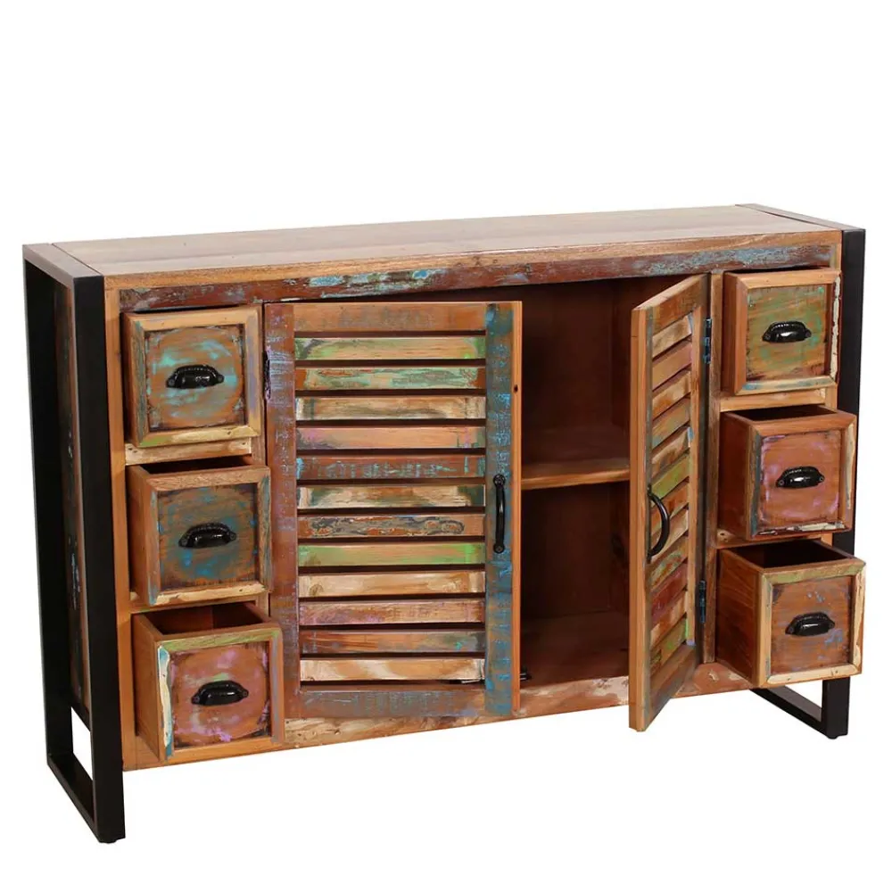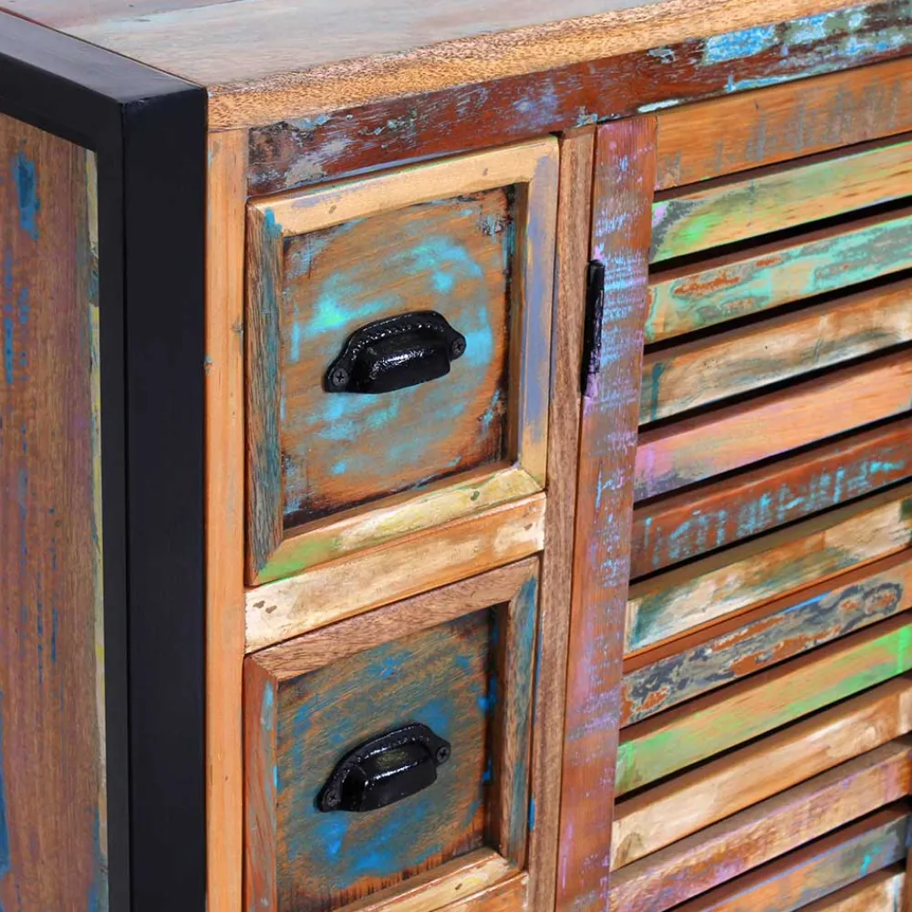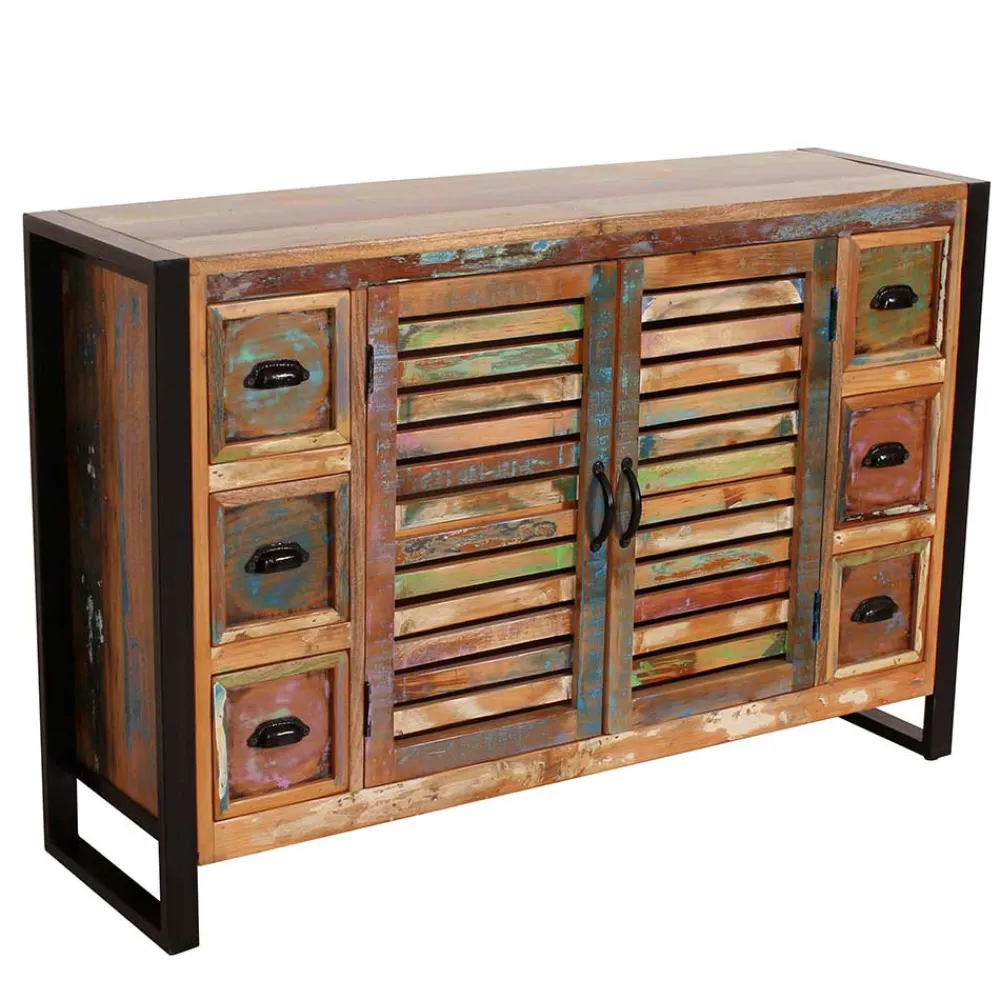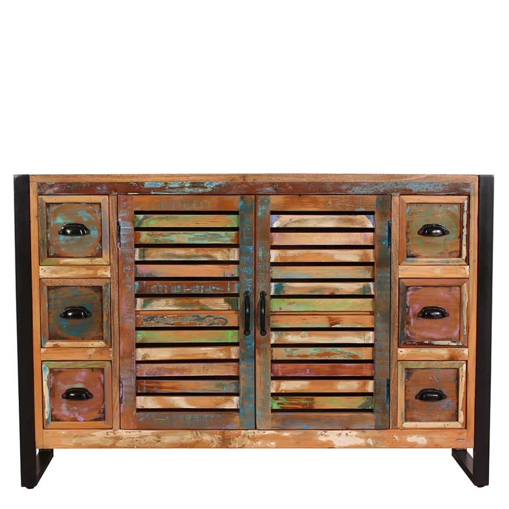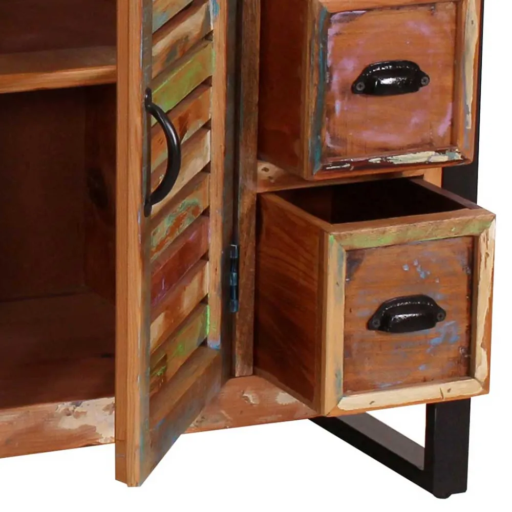 Hergestellt aus Recyclingholz und Altmetall, bietet die Kommode „Vosbadus“ eine umweltbewusste Wahl ohne Kompromisse bei der Qualität. Recyclingholz wird aus wiederverwendeten Quellen gewonnen und verleiht jedem Möbelstück eine besondere Note der Nachhaltigkeit. Altmetall sorgt für die charakteristischen Details und verstärkt den Vintage-Charme, während es gleichzeitig für Stabilität und Langlebigkeit sorgt. Diese Materialien sind nicht nur ökologisch wertvoll, sondern auch robust und einzigartig.