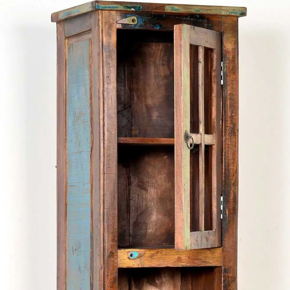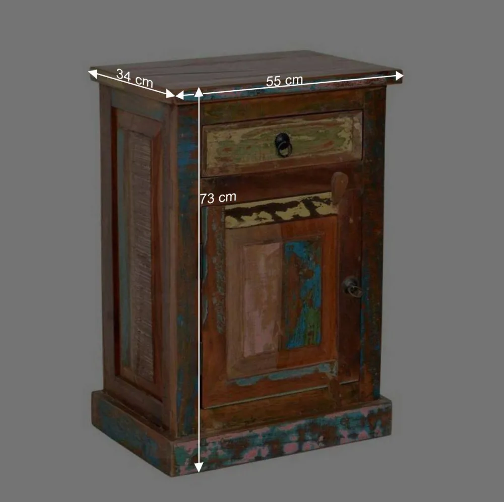 Die Holzoberflächen sind kunstvoll in verschiedenen Farben lackiert und verleihen jedem Möbelstück eine lebendige und fröhliche Note. Die Farbreste auf dem Holz erzählen von einer bewegten Vergangenheit und schaffen eine warme und einladende Atmosphäre in Ihrem Badezimmer.