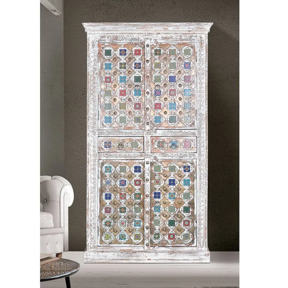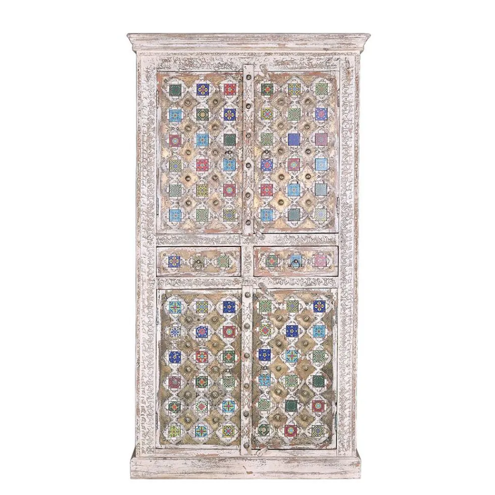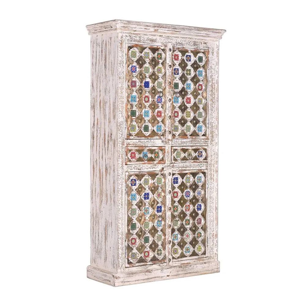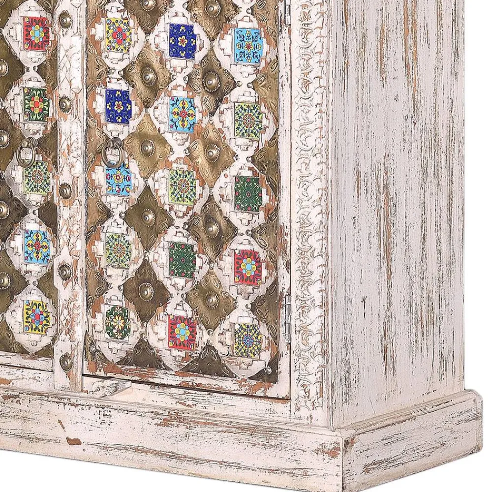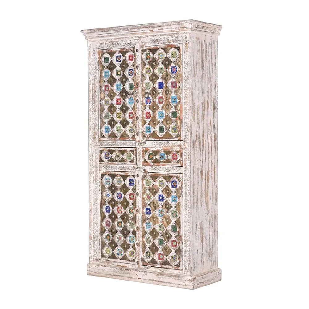 Der Wohnzimmerschrank „Mirell“ überzeugt auf den ersten Blick mit seinem unverwechselbaren Shabby Chic-Stil. In einem charmanten Antikweiß mit farbenfrohen Akzenten gehalten, strahlt er nostalgisches Flair und stilvolle Leichtigkeit aus. Die kunstvoll gestaltete Front mit bunten Mini-Keramikfliesen, die florale Muster zeigen, macht den Schrank zu einem echten Blickfang. Mit seiner Höhe von 185 cm und einer Breite von 100 cm bietet „Mirell“ eine großzügige und stilvolle Möglichkeit, Ordnung ins Wohnzimmer zu bringen.