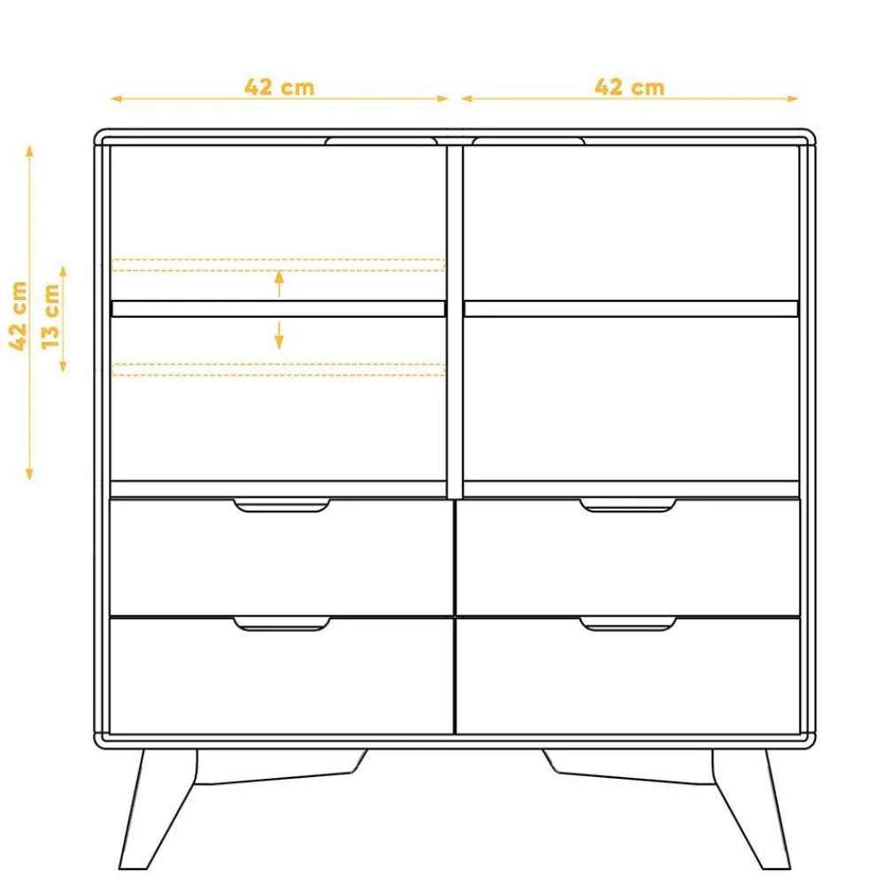 - Innen je ein verstellbarer Einlegeboden mit ca. 2 cm Stärke, Fach Innenmaße ohne Boden gemessen: BxH: je ca. 42×42 cm