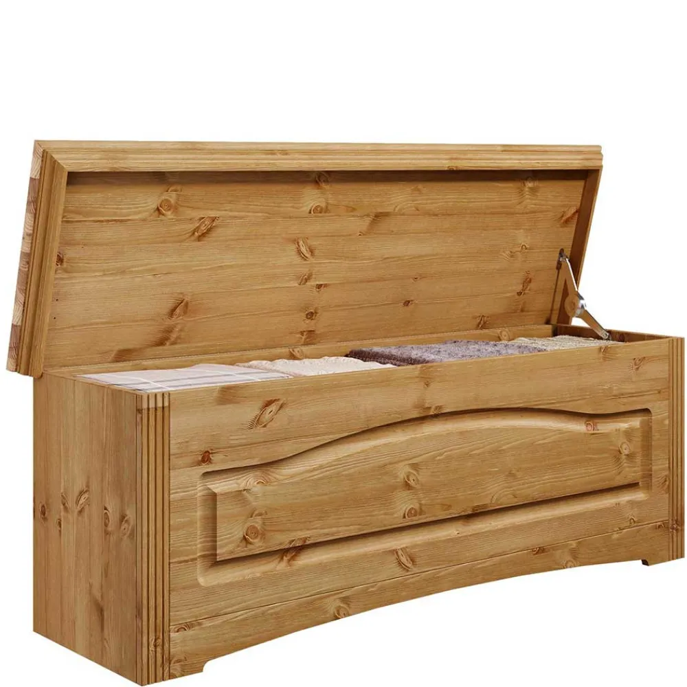 Unsere Wäschetruhe „Vocoja“ wird aus massivem Kiefernholz gefertigt, was nicht nur für eine beeindruckende Stabilität sorgt, sondern auch den natürlichen Charme des Landhausstils unterstreicht. Das Kiefernholz besticht durch seine markante Maserung und seine warme, natürliche Farbe. Die Oberflächen sind sorgfältig und natürlich geölt, wodurch das Holz geschützt wird und gleichzeitig seinen natürlichen Glanz behält. Diese Ölung erhöht die Langlebigkeit des Möbelstücks und verleiht ihm eine angenehme Haptik.