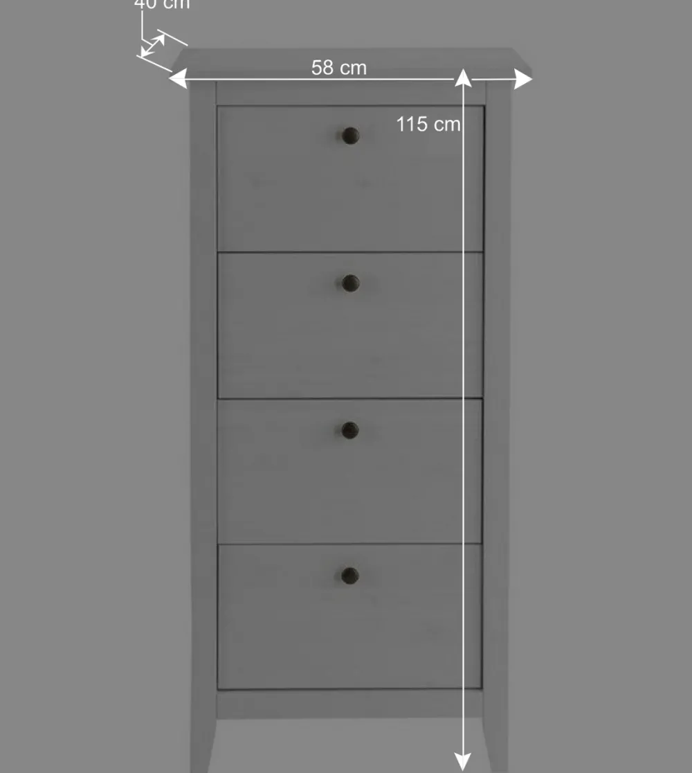 Mit den Maßen von 58 cm in der Breite, 115 cm in der Höhe und 40 cm in der Tiefe, präsentiert sich die Kommode in einem harmonierenden, dezenten Look. Eine leicht überstehende Deckplatte setzt einen zusätzlichen Akzent.