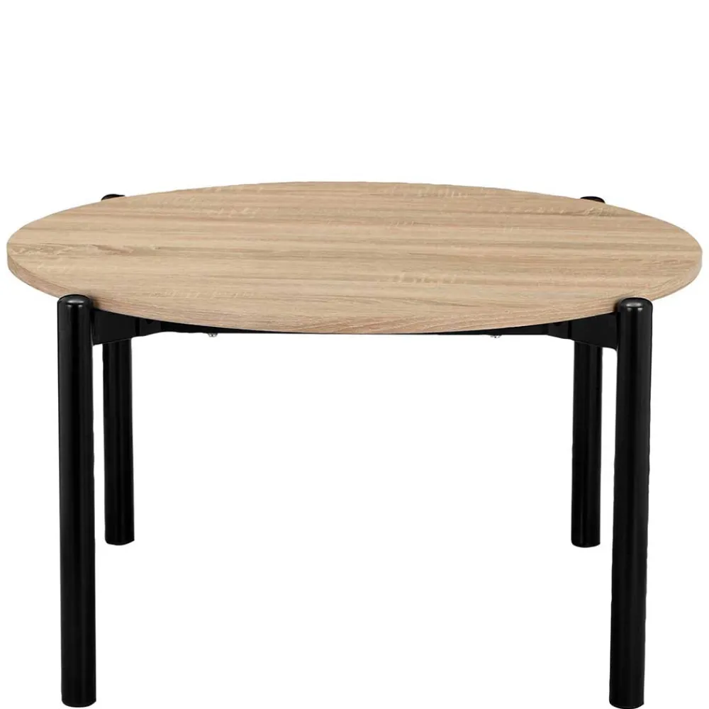 Der „Emrene“ Tisch überzeugt mit einer soliden Verarbeitung. Die runde Tischplatte besteht aus MDF und ist mit einer Folie in Wildeiche-Holzoptik versehen, die die natürliche Maserung des Holzes realistisch imitiert. Das stabile Metallgestell sorgt für sicheren Halt und verfügt über eine Pulverbeschichtung in mattschwarz, die dem Tisch nicht nur eine moderne, sondern auch eine widerstandsfähige Oberfläche verleiht. Die vier Tischbeine sind so gestaltet, dass sie sich oben leicht über die Tischplatte ziehen, was dem Tisch eine besonders markante und funktionale Form verleiht.