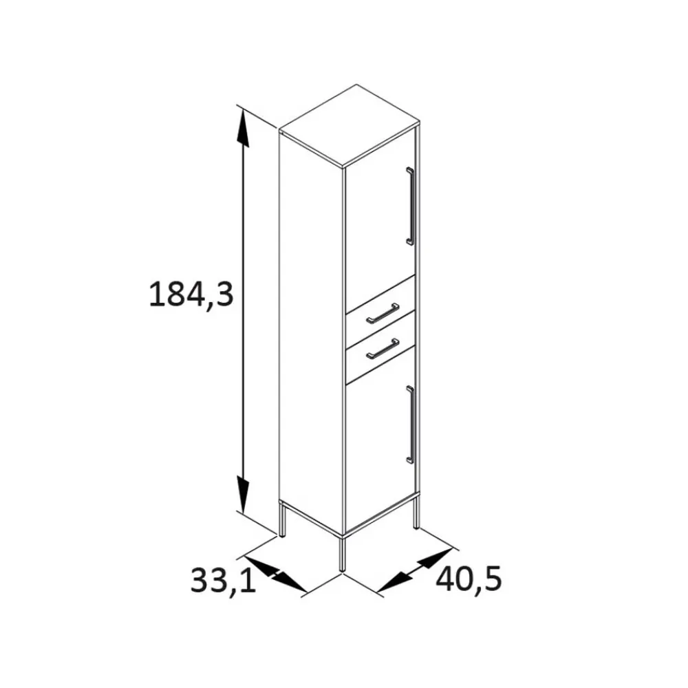 - Hochschrank (41x185x33 cm): Vielseitig und geräumig bietet dieser Hochschrank den idealen Stauraum für alles, was Sie im Bad benötigen. Mit zwei Türen und zwei Schubladen ausgestattet, können Handtücher, Pflegeprodukte und mehr ordentlich verstaut werden. Die verdeckten Einlegeböden in edlem Perlweiß schaffen eine geschützte und hygienische Aufbewahrung für all Ihre Badezimmerartikel. Dank des Soft-Close-Mechanismus und der stabilen Metallauszüge lassen sich die Schubladen geräuschlos und sanft schließen. Besonders die Höhe von 185 cm nutzt den Raum optimal und sorgt dafür, dass all Ihre Utensilien aufgeräumt und doch griffbereit bleiben.