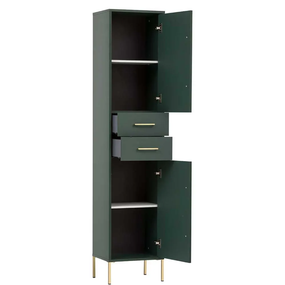 Hochwertige Badeinrichtung, die Funktionalität und Ästhetik in Perfektion vereint: Mit der Badezimmermöbel-Serie „Aqua“ zieht nicht nur modernes Design in Ihr Zuhause ein, sondern auch langlebige Qualität aus deutscher Fertigung. Dunkelgrün und goldfarbene Details verleihen diesen Möbeln eine besondere Eleganz, die sofort ins Auge fällt. Durch das beliebte skandinavische Design – schlicht und zugleich wirkungsvoll – verwandelt sich Ihr Badezimmer in eine stilvolle Wohlfühloase. Klare Linien, edle Farben und natürliche Materialien schaffen ein harmonisches Ambiente, das Sie jeden Tag aufs Neue begeistern wird.