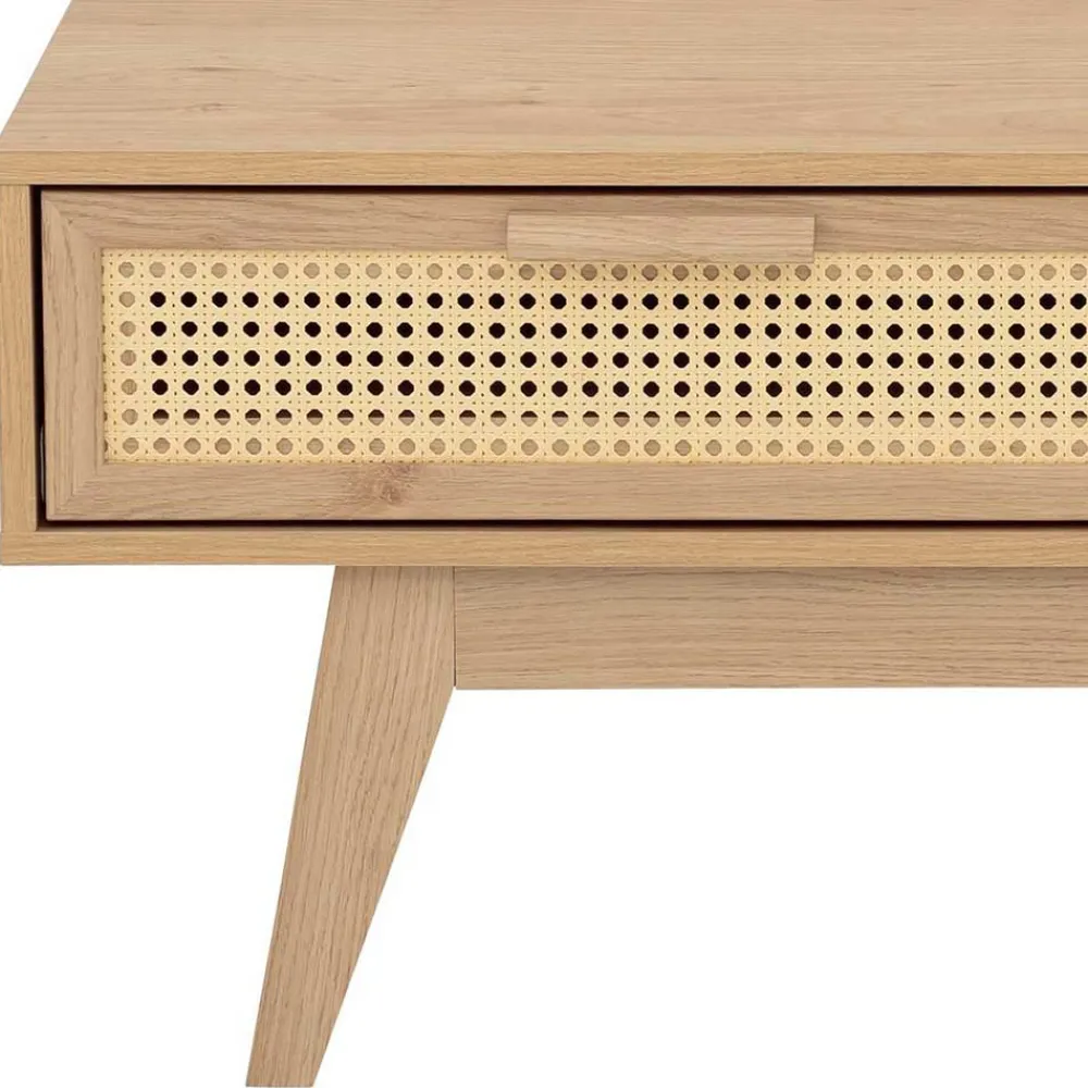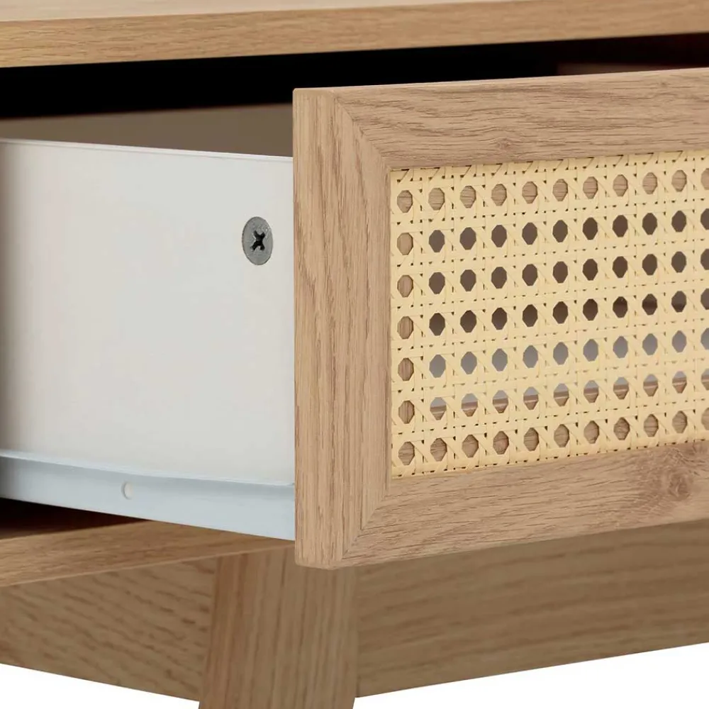 Der „Oraina“ Tisch besteht aus einer durchdachten Kombination hochwertiger Materialien: Die Tischplatte ist aus MDF-Platte gefertigt, die mit einer pflegeleichten Eiche-Optik-Folie versehen ist. Dies sorgt für eine strukturierte Oberfläche, die nicht nur natürlich aussieht, sondern sich auch gut anfühlt. Der stabile Korpus ist aus Spanplatte und Gummibaum Massivholz gearbeitet, was dem Tisch zusätzlich eine hohe Standfestigkeit und Robustheit verleiht. Das Fußgestell aus massivem Gummibaumholz sorgt für eine stabile Basis und ist ebenfalls mit einer folierten Oberfläche in Eiche-Optik veredelt. Die dekorativen Schubladenfronten in Wiener Geflecht-Optik verleihen dem Tisch einen besonders reizvollen Charakter.