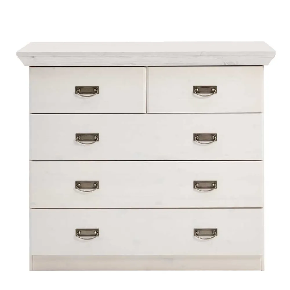 Mit einer Breite von 106 cm, einer Höhe von 91 cm und einer Tiefe von 50 cm bietet diese Kommode reichlich Stauraum, ohne dabei wuchtig zu wirken. Die elegant gefräste Oberplatte verleiht dem Möbelstück eine zusätzliche Note von Raffinesse. Die Kombination aus zwei kleinen und drei großen Schubladen, alle ausgestattet mit einem hochwertigen Metallauszug, ermöglicht eine vielseitige Nutzung und einfache Handhabung.