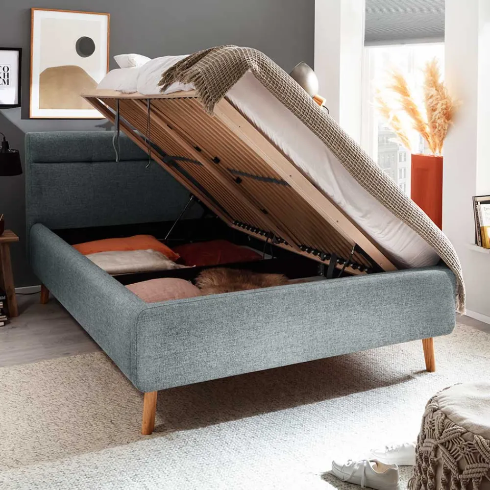 Dieses Bett verfügt über einen belüfteten Bettkasten, der seitlich mit Gasdruckfedern geöffnet werden kann. Dieser Bettkasten bietet Ihnen zusätzlichen Stauraum für Bettwäsche, Kissen und andere Utensilien, während er gleichzeitig eine gute Belüftung gewährleistet, um ein frisches Schlafklima zu erhalten.