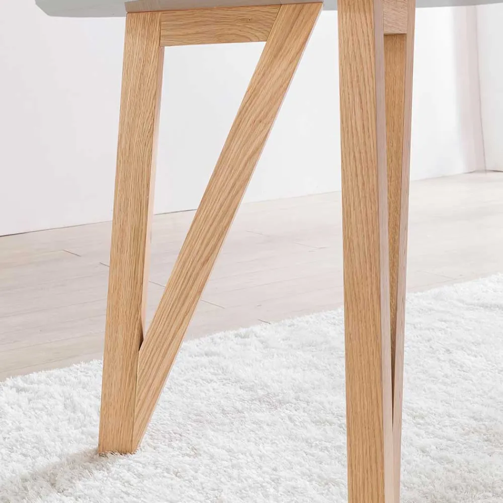 Die Tischplatte überzeugt durch ihre solide Stärke und dezent abgerundete Kanten. Diese sorgen nicht nur für eine angenehm weiche Haptik, sondern minimieren auch das Verletzungsrisiko – besonders praktisch, wenn Kinder mit am Tisch sitzen. Getragen wird die Platte von einem dekorativen Vierfußgestell aus massivem, naturbelassenem Eichenholz. Dieses Detail verleiht dem Tisch nicht nur Charakter, sondern sorgt auch für Standfestigkeit und Langlebigkeit.