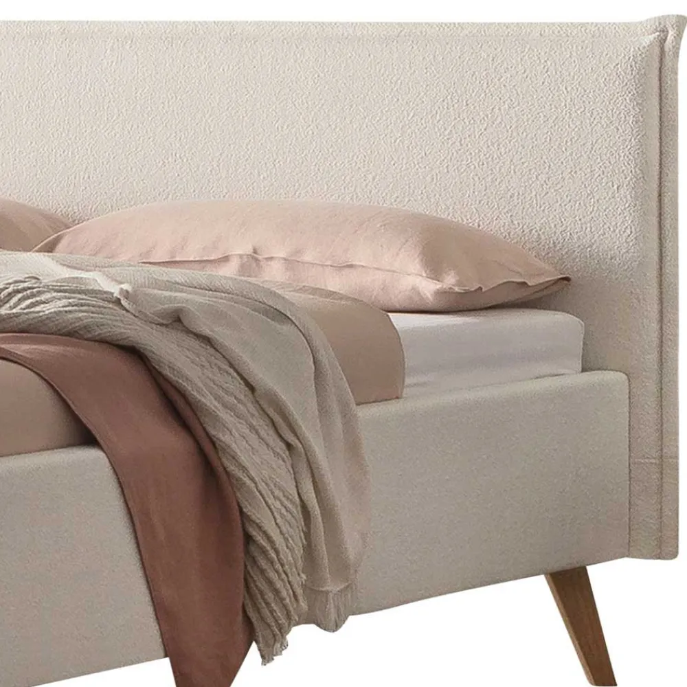 Das Kopfteil und die Umrandung sind mit einem hochwertigen Boucle Bezug bezogen, der aus 90 % Polyester, 5 % Baumwolle und 5 % Polyacryl besteht. Dieser einladende Bezug in Cremefarben verleiht dem Bett eine luxuriöse Ausstrahlung und verführt dazu, sich gemütlich einzukuscheln. Boucle ist ein textiler Stoff, der sich durch eine besonders weiche Oberfläche auszeichnet und für seinen hohen Komfort bekannt ist.