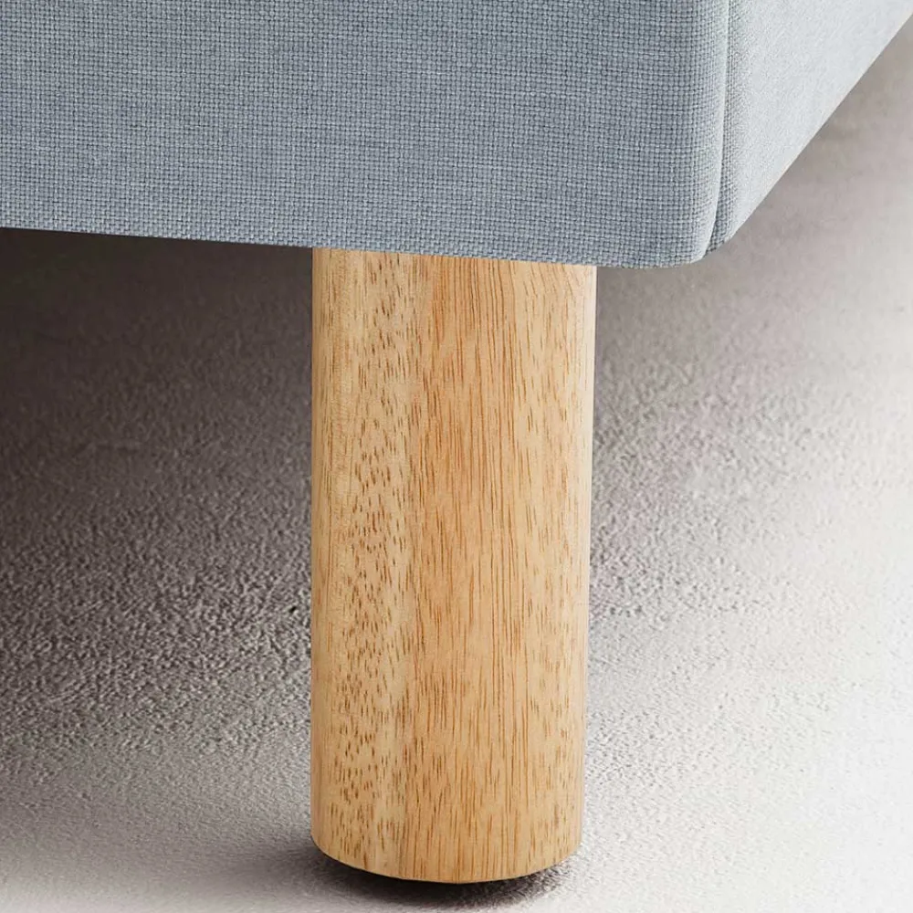 Der Bettrahmen und das Kopfteil sind komplett mit dem hochwertigen hellblauen Webstoff bezogen, was für eine harmonische und moderne Optik sorgt. Dank der stabilen Konstruktion aus Spanplatte und den zusätzlichen Stützfüßen am Mittelsteg bietet das Bett eine hohe Stabilität und ist bis zu 120 kg belastbar. Das Vierfußgestell aus massivem Eichenholz in Eichefarben setzt einen warmen, natürlichen Akzent und sorgt für den nötigen Halt.