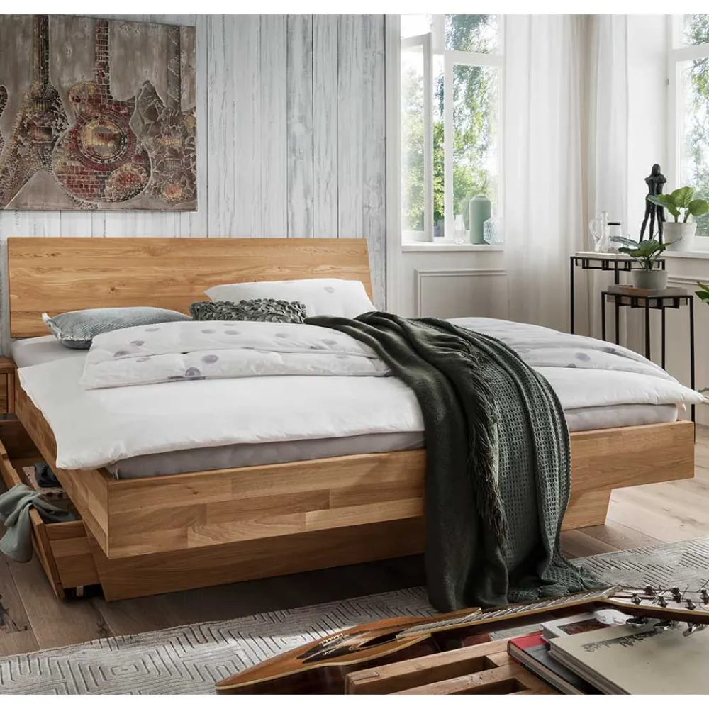 Wildeichenholz zählt zu den robustesten und langlebigsten Holzarten und bietet neben seiner außergewöhnlichen Widerstandsfähigkeit auch optische Raffinesse. Die markanten Maserungen, Astlöcher und natürlichen Wuchsrisse sind kein Makel, sondern ein Zeugnis der Natürlichkeit – und machen jedes Bett zu einem echten Unikat. Die natürliche Ölung des Holzes schützt die Oberfläche und unterstreicht die atemberaubende Struktur. Zudem sorgt die offenporige Holzstruktur für ein optimales Raumklima, da sie Feuchtigkeit reguliert und eine gesunde Schlafumgebung fördert.