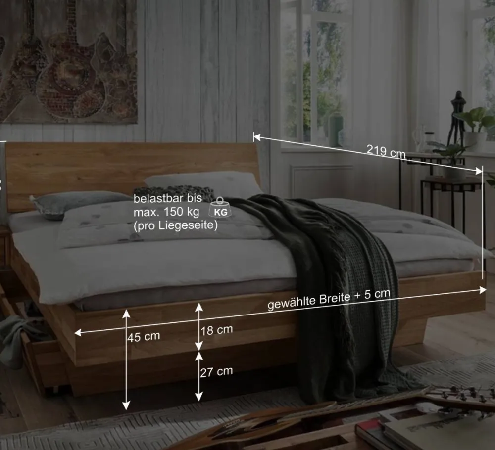 Durch den stabilen, zurückgesetzten Holzsockel entsteht ein schwebender Eindruck, der nicht nur optisch beeindruckt, sondern das Bett trotz seiner massiven Bauweise leicht und elegant wirken lässt. Die komfortable Einstiegshöhe von 45 cm erleichtert das Ein- und Aussteigen, schont Rücken und Gelenke und sorgt für einen besonders hohen Schlafkomfort.