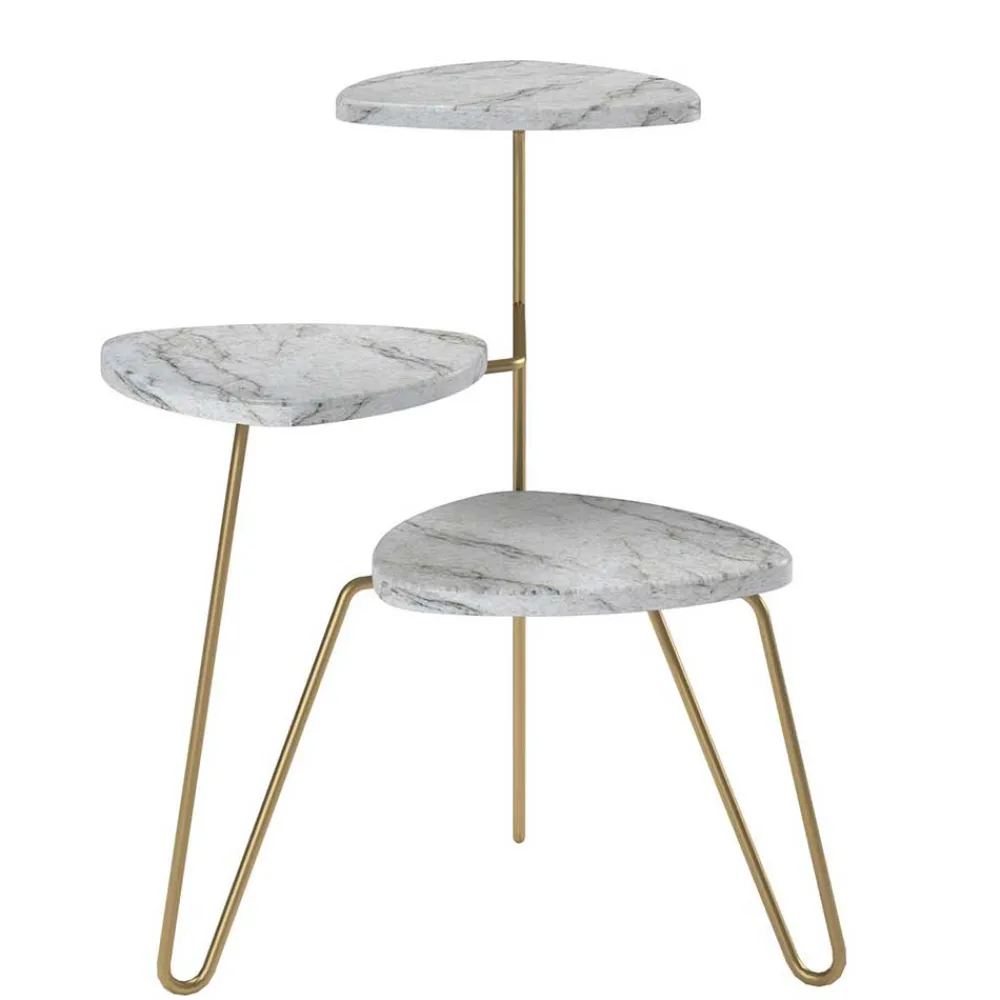 Der Blumenständer „Botanios“ ist aus strapazierfähiger Spanplatte und robustem Metall gefertigt. Die Platten in Wankelform auf drei Etagen präsentieren sich in edler Marmor Optik, die durch die dezente Rundung der Kanten zusätzlich an Charme gewinnt.