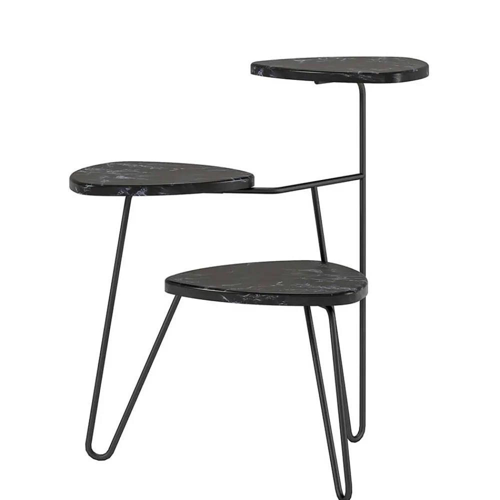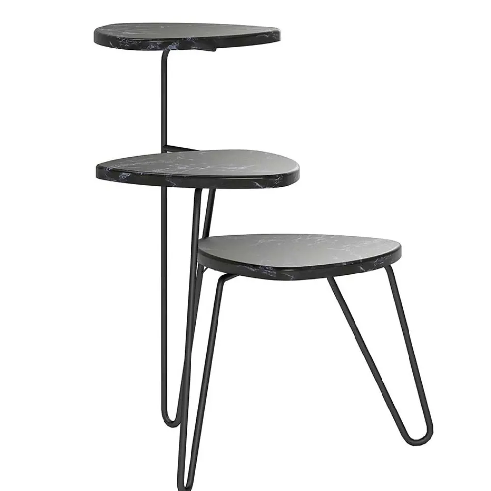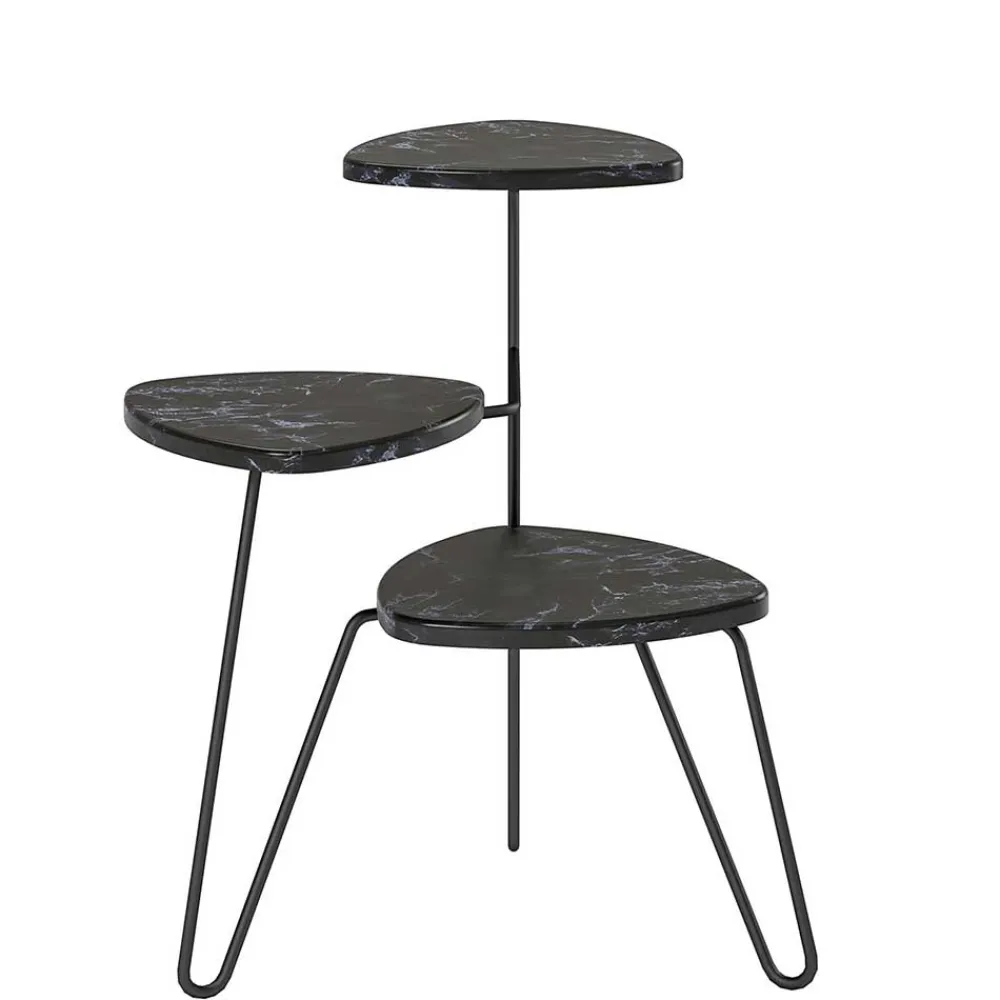 Der Blumenständer besteht aus einer gelungenen Kombination von Spanplatte und Metall. Die Platten in Wankelform auf drei Etagen verleihen dem Möbel eine verspielte Note. Die Spanplatte ist mit einer edlen Marmoroptik foliert und zeichnet sich durch dezent abgerundete Kanten aus. Die Tischplatten können jeweils mit bis zu 1,8 kg belastet werden, sodass Sie Ihre liebsten Blumenarrangements perfekt präsentieren können. Das standsichere Metall-Dreibeingestell in Haarnadelform ist schwarz pulverbeschichtet und sorgt für eine harmonische Verbindung von Stabilität und Retro-Charme. Das Gesamtgewicht des Blumenständers beträgt ca. 6,4 kg.