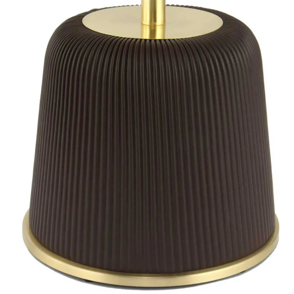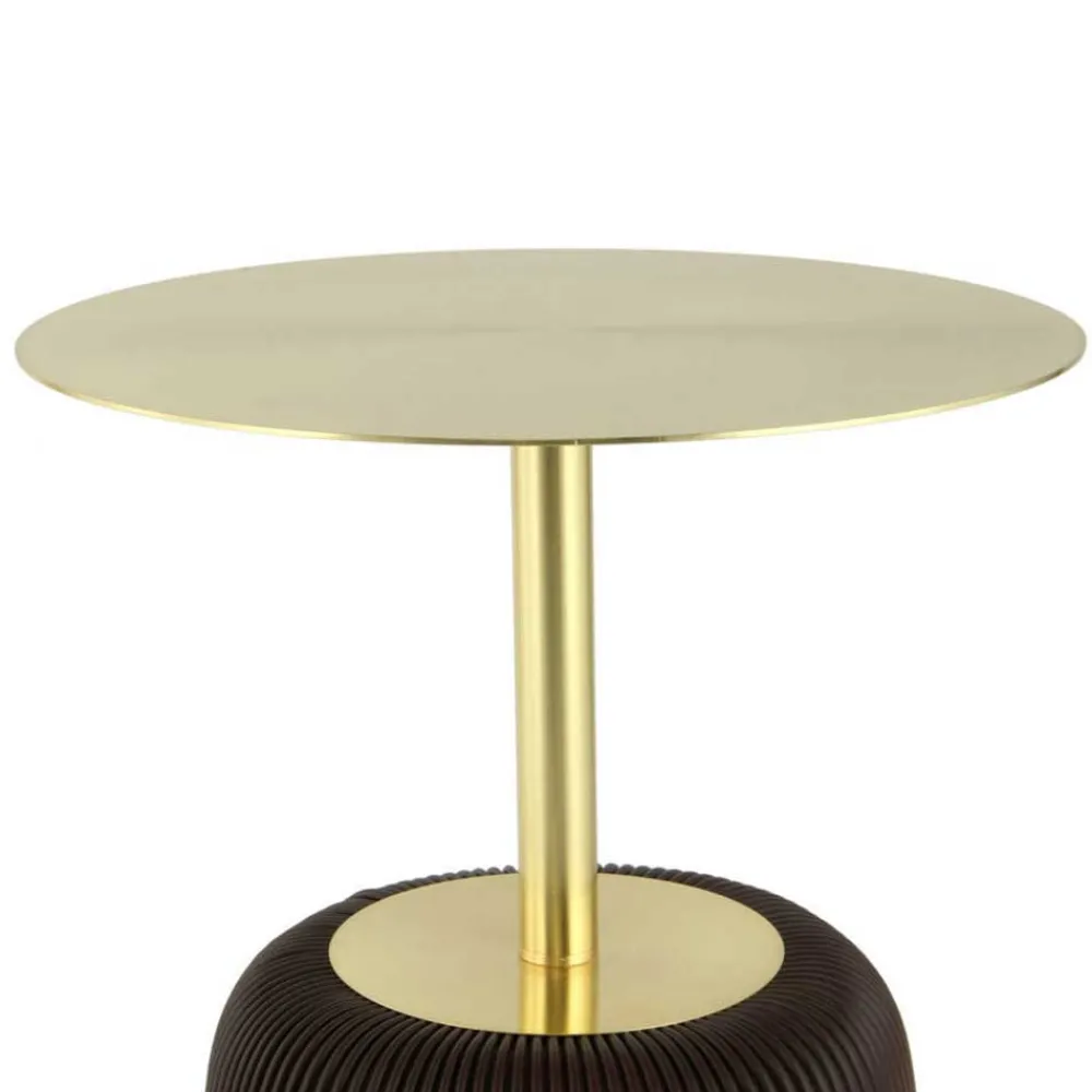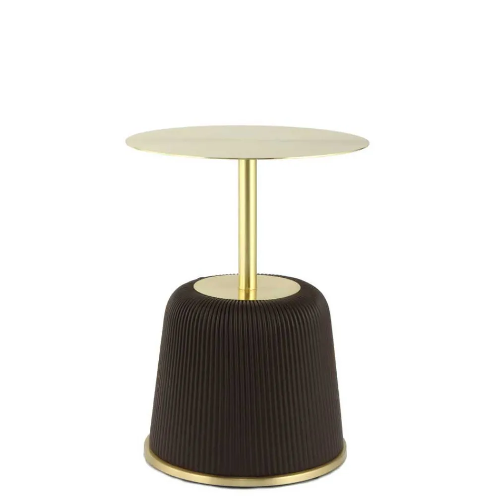 Der „Elixar“ Beistelltisch wurde aus Kunstleder, Metall und MDF-Platte gefertigt und überzeugt durch seine langlebige und stabile Bauweise. Die runde Tischplatte aus Metall ist 2 mm stark und in edlem Gold gehalten, wodurch der Tisch einen besonders luxuriösen Eindruck hinterlässt. Das markante Säulengestell besteht aus einer robusten MDF-Basis und einer eleganten Säule aus Gold-Metall. Der Sockelfuß des Tisches bildet das optische Highlight: In einer glockenartigen Form gehalten, ist er mit Kunstleder (100% Polyurethan) in Dunkelbraun bezogen und in einer raffinierten Rillenoptik gestaltet. Diese Details machen den „Elixar“ zu einem echten Hingucker.
