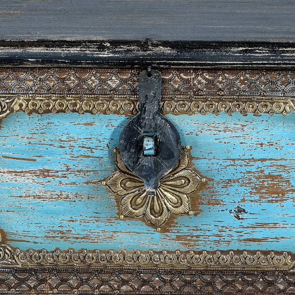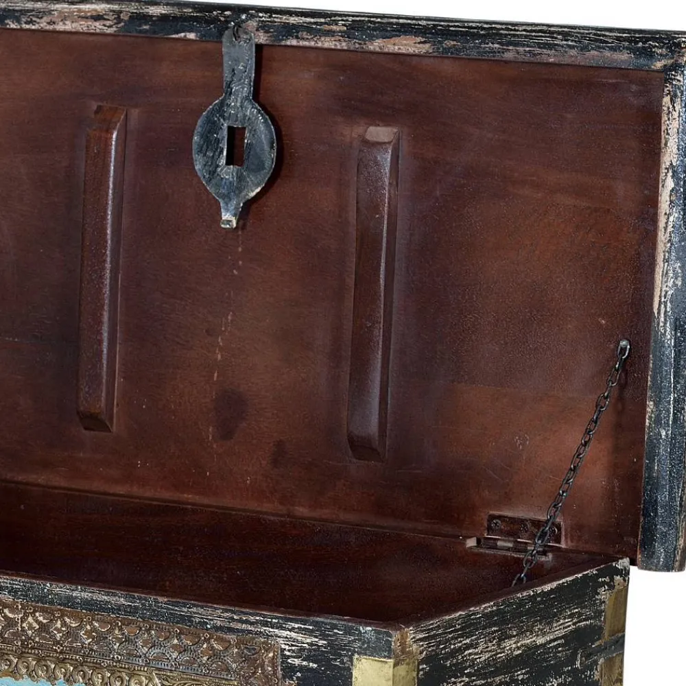 Die „Branle“ Truhe wurde aus robustem Mangobaum-Massivholz gefertigt, das für seine Stabilität und Langlebigkeit bekannt ist. Das handbemalte und lackierte Holz wurde zusätzlich mit kunstvollen Metall-Applikationen in Bronze veredelt. Diese Kombination aus Holz und Metall bringt nicht nur eine warme Ausstrahlung in Ihr Zuhause, sondern garantiert auch eine lange Lebensdauer des Möbelstücks. Die dekorativen Ornamentmuster auf der Front machen jedes Exemplar zu einem einzigartigen Unikat. Die Oberflächen sind von Hand bearbeitet, sodass jedes Detail mit größter Sorgfalt und Hingabe gestaltet wurde.