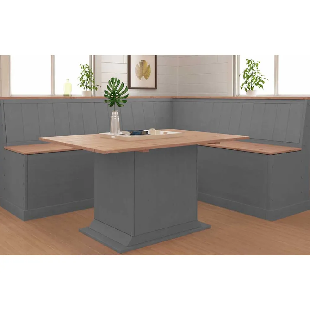 Die Truhen-Eckbank „Bernau“ vereint rustikale Eleganz mit durchdachtem Stauraum und wird zum perfekten Mittelpunkt Ihres Essbereichs. Die zweifarbige Gestaltung in Grau und Kieferfarben unterstreicht den gemütlichen Landhausstil, während die massive Kiefernholz-Konstruktion für langlebige Stabilität sorgt. Mit ihren großzügigen Sitzflächen bietet sie Platz für vier Personen und lädt zu geselligen Runden ein.