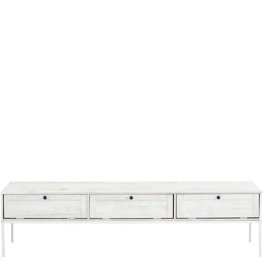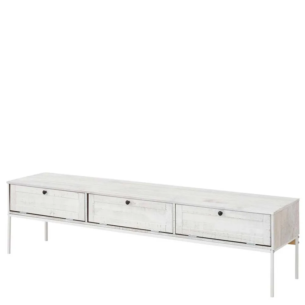 Das schlanke Vierfußgestell aus in Weiß lackiertem Metall sorgt nicht nur für Stabilität, sondern verleiht dem TV-Board auch eine gewisse Leichtigkeit. Mit einer Höhe von ca. 25 cm bietet es ausreichend Bodenfreiheit, um das Möbelstück leicht zu reinigen und zu pflegen. Diese Konstruktion gewährleistet eine langlebige Nutzung und fügt sich harmonisch in jedes moderne Wohnambiente ein.