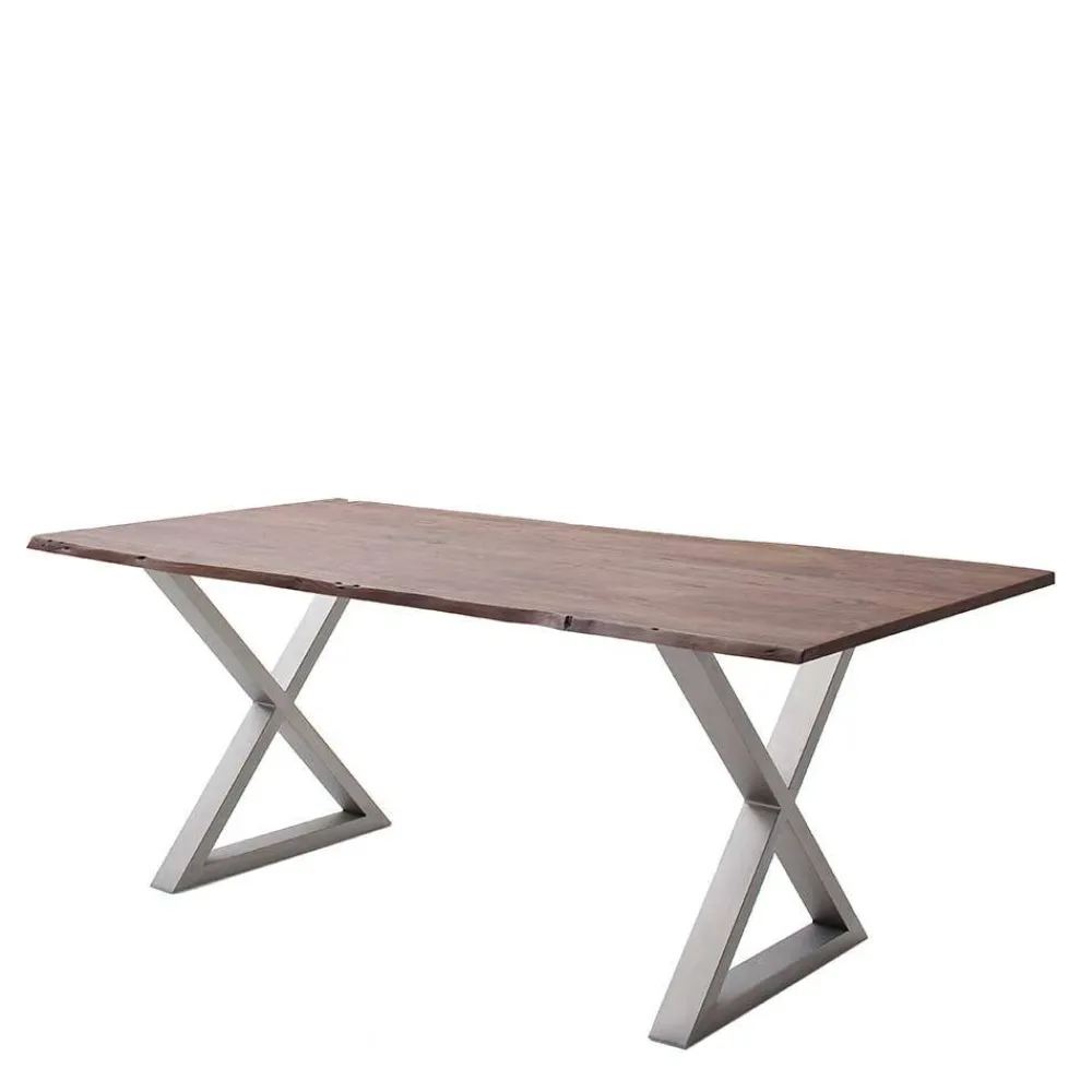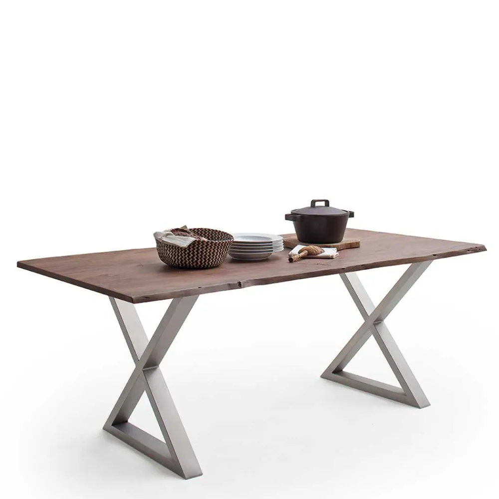Ein Highlight des Waldkantentisches „Bekunion“ sind die einzigartigen Naturkanten an den Längsseiten der Tischplatte. Diese Kanten werden direkt aus dem Stamm geschnitten und verleihen jedem Tisch eine individuelle Note. Die solide Tischplatte hat eine Stärke von etwa 2,5 cm und bietet eine robuste und stabile Oberfläche. Das stylische Gestell besteht aus zwei X-förmigen Elementen mit breiter Bodenauflage, die für einen sicheren Stand sorgen und gleichzeitig ein optisches Highlight setzen.