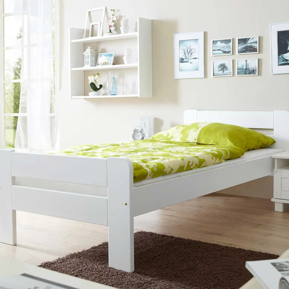 Das Einzelbett „Jean“ ist in zwei praktischen Größen erhältlich – wahlweise mit einer Liegefläche von 90×200 cm oder 100×200 cm. So finden Sie genau die passende Größe für Ihr Schlafzimmer und Ihre individuellen Bedürfnisse. Kombinieren Sie das Bett mit einer Matratze Ihrer Wahl (bis 18 cm Höhe) und einem passenden Rollrost, um Ihren Schlafkomfort zu maximieren. In unserem Shop finden Sie eine große Auswahl an passenden Matratzen und Lattenrosten.