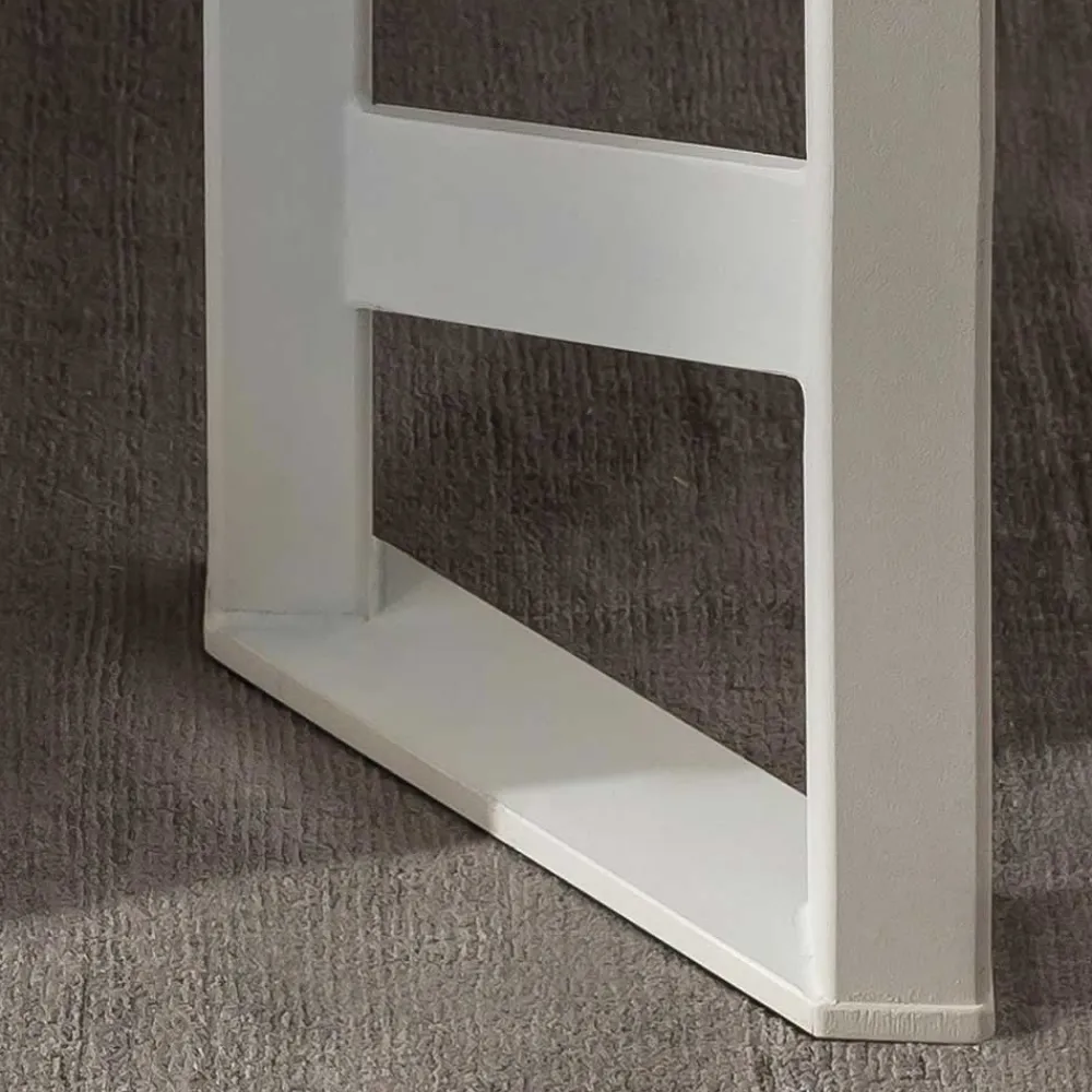 Die Holzoberflächen sind lackiert, was den Holzton hervorhebt und gleichzeitig das Material schützt. Die Stabverleimung sorgt für zusätzliche Stabilität und unterstreicht die hochwertige Verarbeitungsqualität. Der Metallrahmen ist weiß pulverbeschichtet, ein Verfahren, das das Metall vor Korrosion schützt und ihm eine ansprechende, gleichmäßige Oberfläche verleiht.