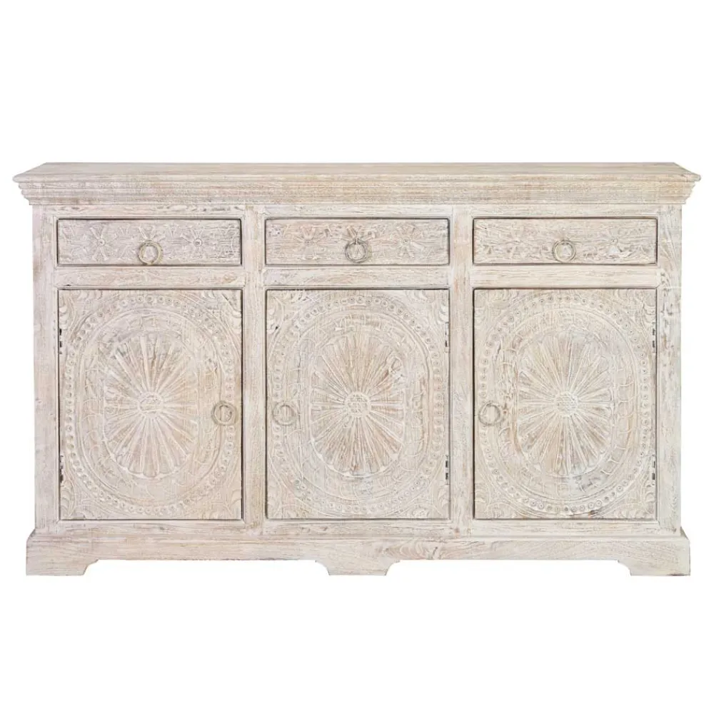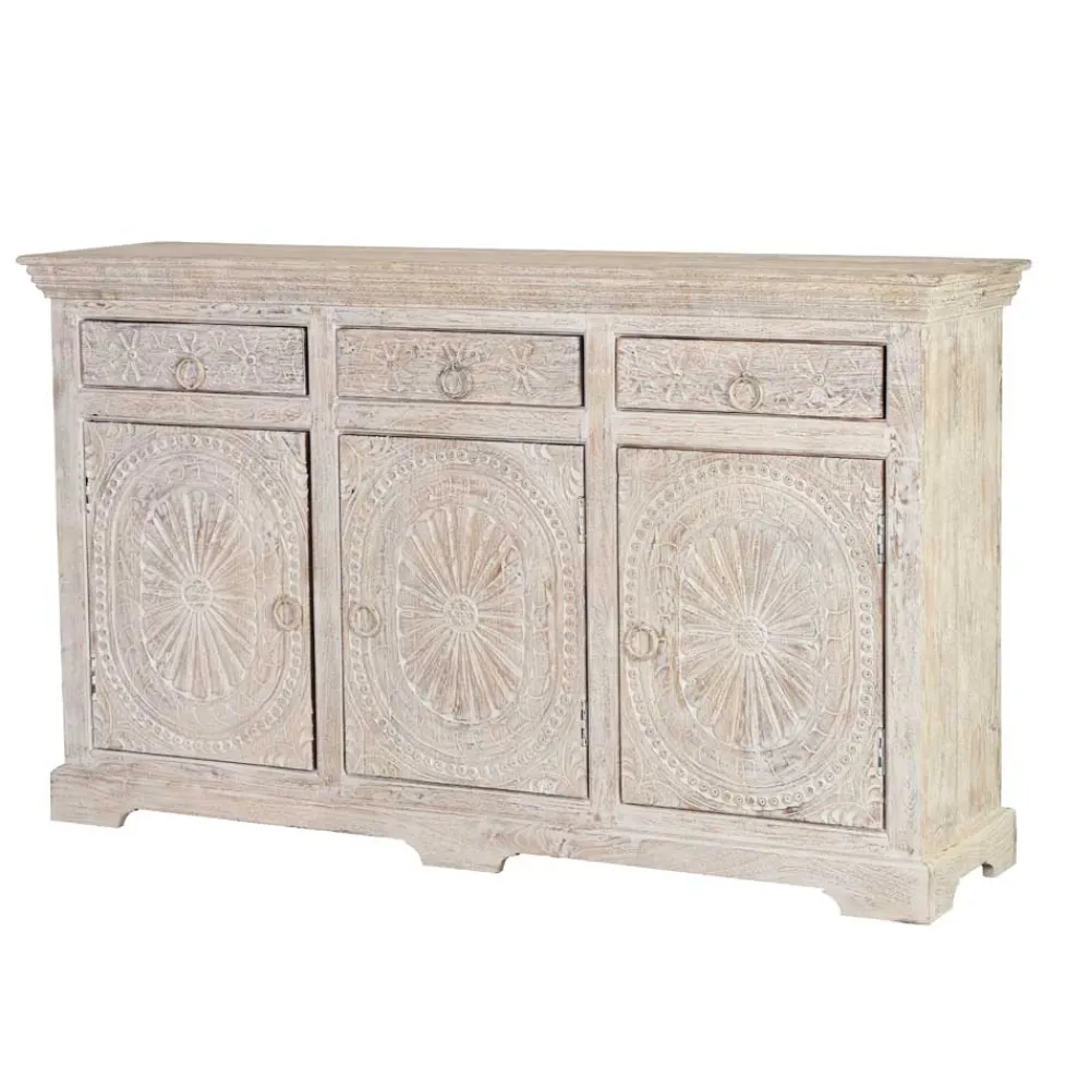 - Oberflächen mit White Wash Effekt behandelt und von Hand beschnitzt