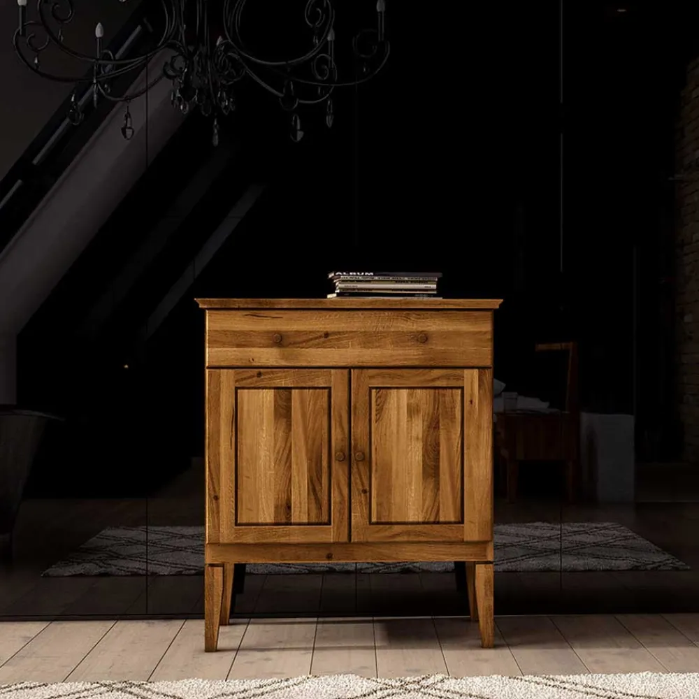 Eine robuste Konstruktion wird bei der Kommode „Masdamos“ großgeschrieben. Mit einer starken Deckplatte von 2,5 cm und Front sowie Seiten von 2 cm Stärke steht sie für Beständigkeit und Langlebigkeit. Das Design wird durch die profilierte Kante der Deckplatte abgerundet, die der Kommode eine feine, handwerkliche Note verleiht.