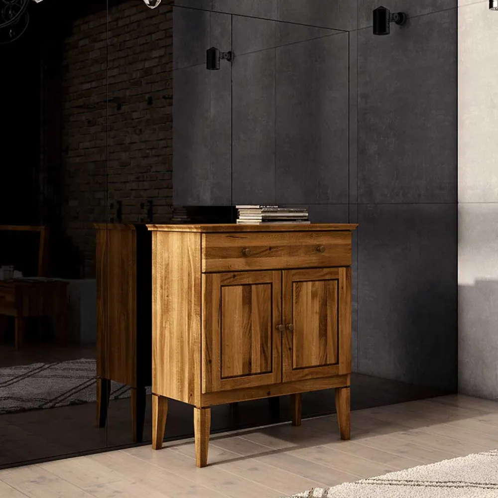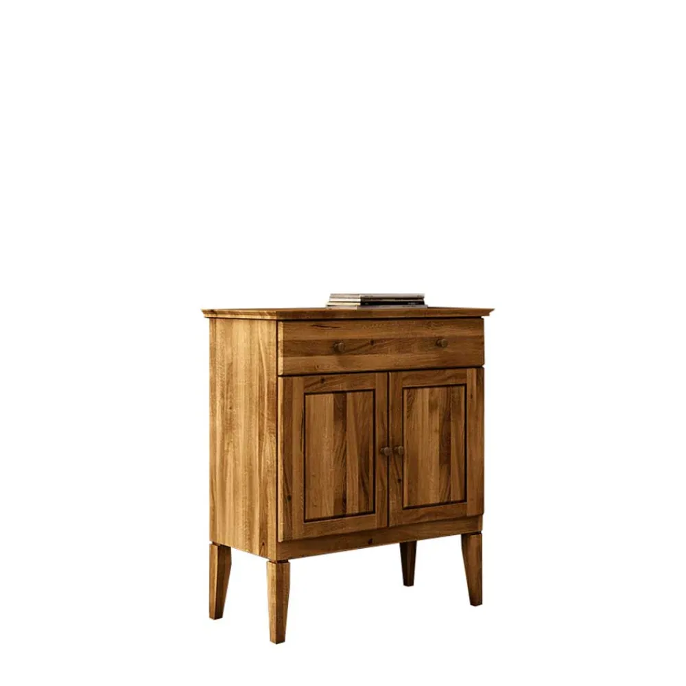 Zwei Türen mit Dämpfung garantieren ein sanftes und leises Schließen, was den Komfort im täglichen Gebrauch spürbar erhöht. Hinter jeder Tür verbirgt sich ein Einlegeboden, der für Ordnung und Übersicht sorgt. Die geräumige Schublade gleitet sanft auf langlebigen Metallführungen und schließt dank der Soft-Close-Funktion leise und schonend. Abgerundet wird die Funktionalität durch die dezente Holzknopfgriffe, die das naturverbundene Design unterstreichen.