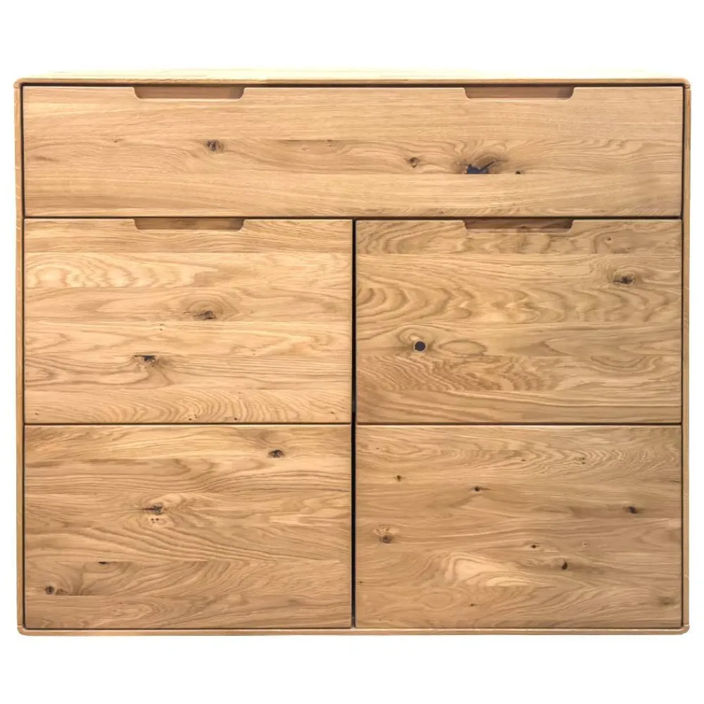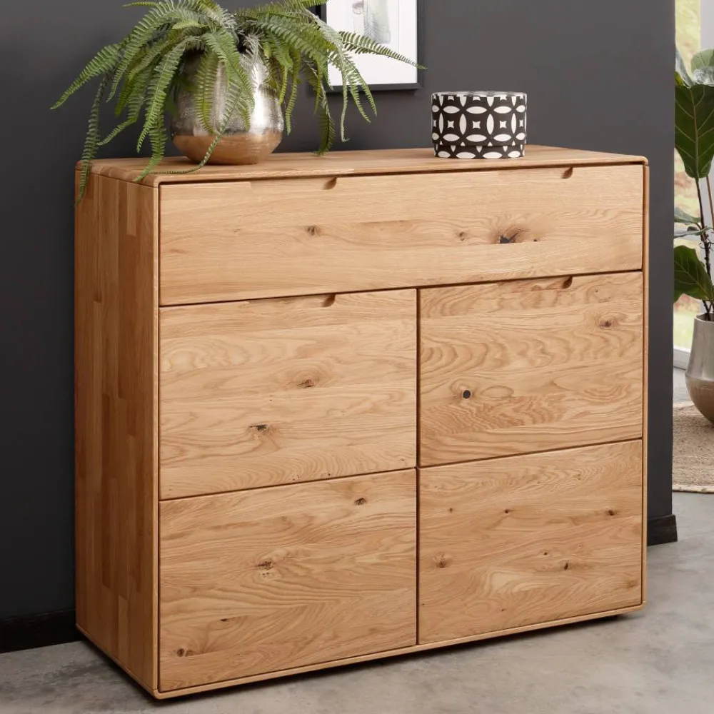 Die massiven Wildeiche-Elemente der Kommode tragen aktiv zu einem gesunden Raumklima bei. Holz reguliert auf natürliche Weise die Luftfeuchtigkeit, was zu einer angenehmen Wohnatmosphäre beiträgt. Die sorgfältig abgerundeten Kanten zeugen von exzellenter Verarbeitung und sorgen nicht nur für eine elegante Optik, sondern auch für Sicherheit in Ihrem Zuhause.