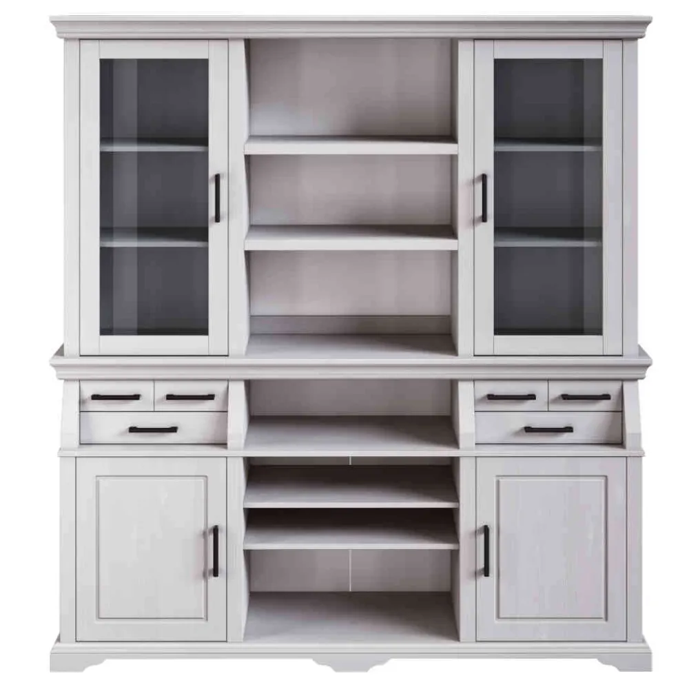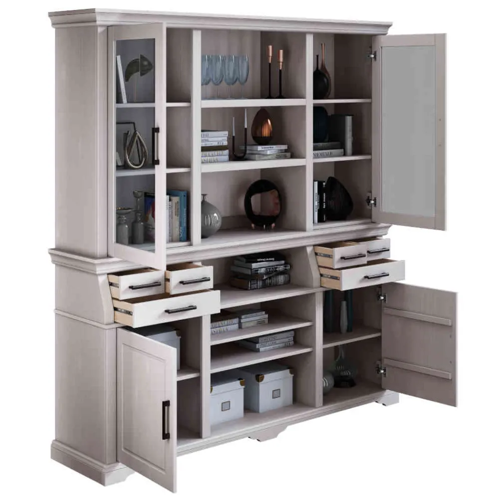 Hinter der stilvollen Fassade verbirgt sich ein wahres Stauraumwunder. Sechs geräumige Schubladen mit hochwertigen Metallauszügen bieten reichlich Platz für Besteck, Tischwäsche oder alltägliche Kleinigkeiten. Hinter den vier Türen – zwei mit stilvollem Glaseinsatz, zwei aus Massivholz – lassen sich Gläser, Geschirr oder Lieblingsstücke ordentlich verstauen und zugleich dekorativ in Szene setzen. Die sieben offenen Fächer in der Mitte laden ein zum Präsentieren von Kochbüchern, kleinen Pflanzen oder Dekoelementen – ganz nach Ihrem Geschmack.