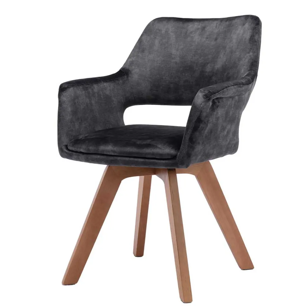 Die 360-Grad-Drehfunktion des Vierfußgestells aus massivem Holz in Eichefarben verleiht dem Stuhl eine spielerische Note. Die ca. 38 cm hohe Rückenlehne mit einem dekorativen Ausschnitt setzt zusätzliche Akzente und verleiht dem „Tiamo“ seinen einzigartigen Charme. Die Armlehnen bieten mit einer Unterschubhöhe von ca. 62,5 cm zusätzlichen Komfort.