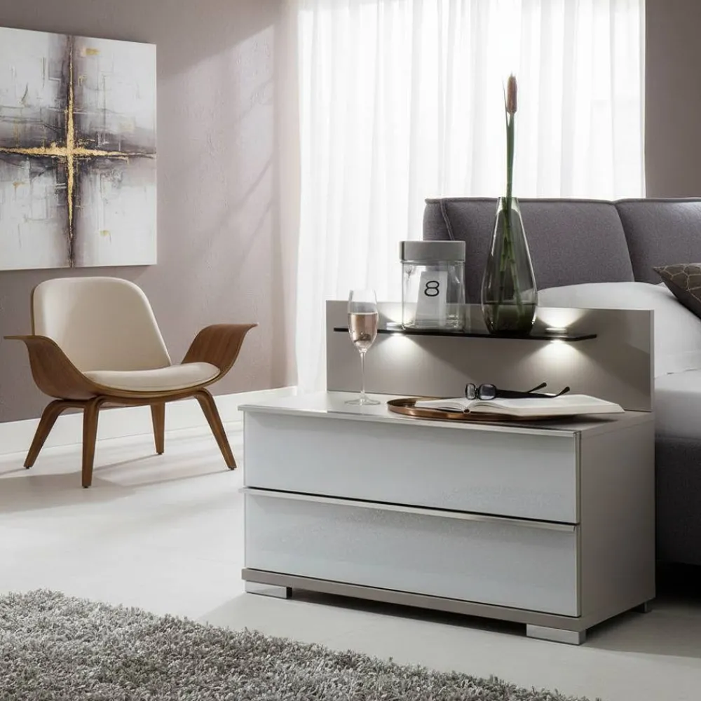 Ein herausragendes Feature der „Tumiva“ Nachtkonsole ist das innovative LED-Touch-Beleuchtungssystem am Rauchglasboden des aufgesetzten Wandpaneels. Mit nur einer Berührung können Sie eine sanfte, einladende Beleuchtung aktivieren, die eine entspannende Atmosphäre schafft, ideal zum Lesen oder Entspannen vor dem Schlafengehen.