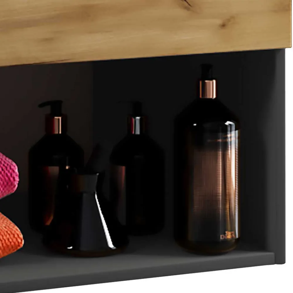 Gefertigt aus robustem Holzwerkstoff und Sicherheits-Spiegelglas bietet das Set eine solide, alltagstaugliche Basis für den täglichen Einsatz. Die melaminbeschichteten Oberflächen in Anthrazit und Wildeiche Honigfarben sind nicht nur optisch ein Highlight, sondern auch besonders pflegeleicht und widerstandsfähig gegen Feuchtigkeit, Kratzer und Verschmutzungen – ideal für das anspruchsvolle Badezimmerumfeld. Einfach abwischen, sauber, fertig.
